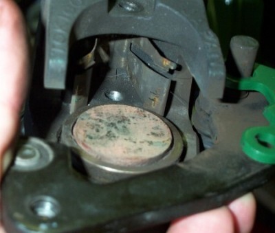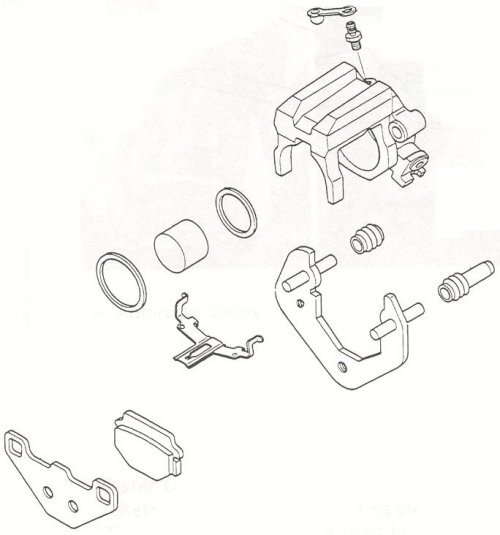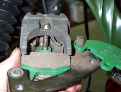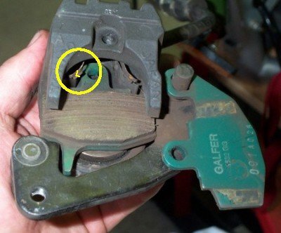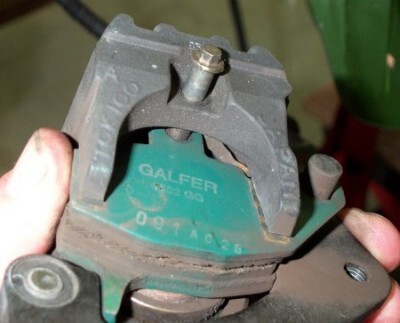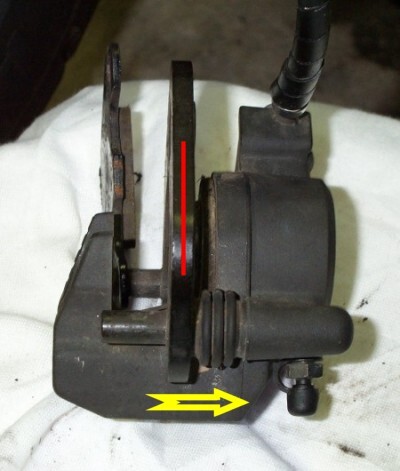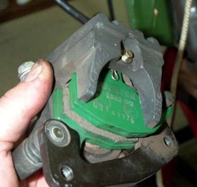 The picture above shows the start of the pad removal. The piston is fully open, so the top pad can be swung out and removed from the mounting post.