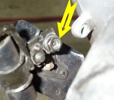 To start, this is not necessary, but you'll probably find it easier to replace the brake pads if the caliper is able to be moved freely about. If you choose to do this, you only have to remove the nut behind the reflector that holds the entire assembly to the tab on the fork tube - pointed to by the arrow in the above picture.