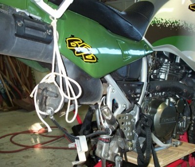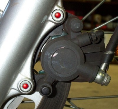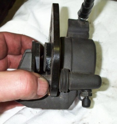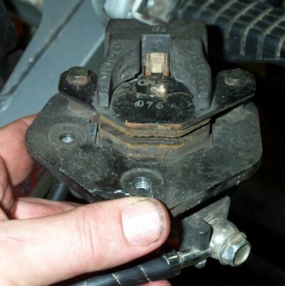 The rear is shown in the photo above, but the idea is the same. It's my suggestion that you either hang the caliper by its frame in such a way that you can easily work on it, or that you have something like a 5 gallon pail available to lay the caliper on. Don't allow the caliper to just hang by the brake line, tie it up with rope or wire. On the front, I hung the caliper with a rope around it and the handlebars.