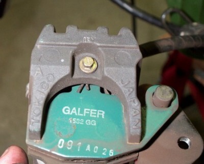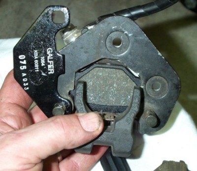 Shown above is the start of the procedure. Note the "legs" of the hairpin sticking out at the top of the "U" just above the Galfer text. That isn't a bolt, but rather a pin with a bolt head. Turn the pin until the head of the hairpin is sticking out and available - (as in the last picture of this front procedure) - and remove it with needle nose pliers, or whatever works best for you.