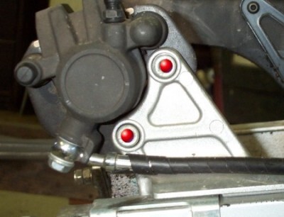 Remove the two caliper mounting bolts, shown in the picture above, and marked with red dots. As with the front, remove the bottom bolt, and then hold the caliper as you remove the top bolt.