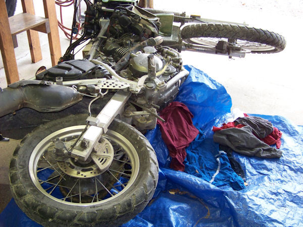 I had the tank and other stuff off to do a valve adjustment. This does NOT have to be done if all you have to do is repair your drain threads. I threw a tarp over an old tire and laid the bike over onto it.